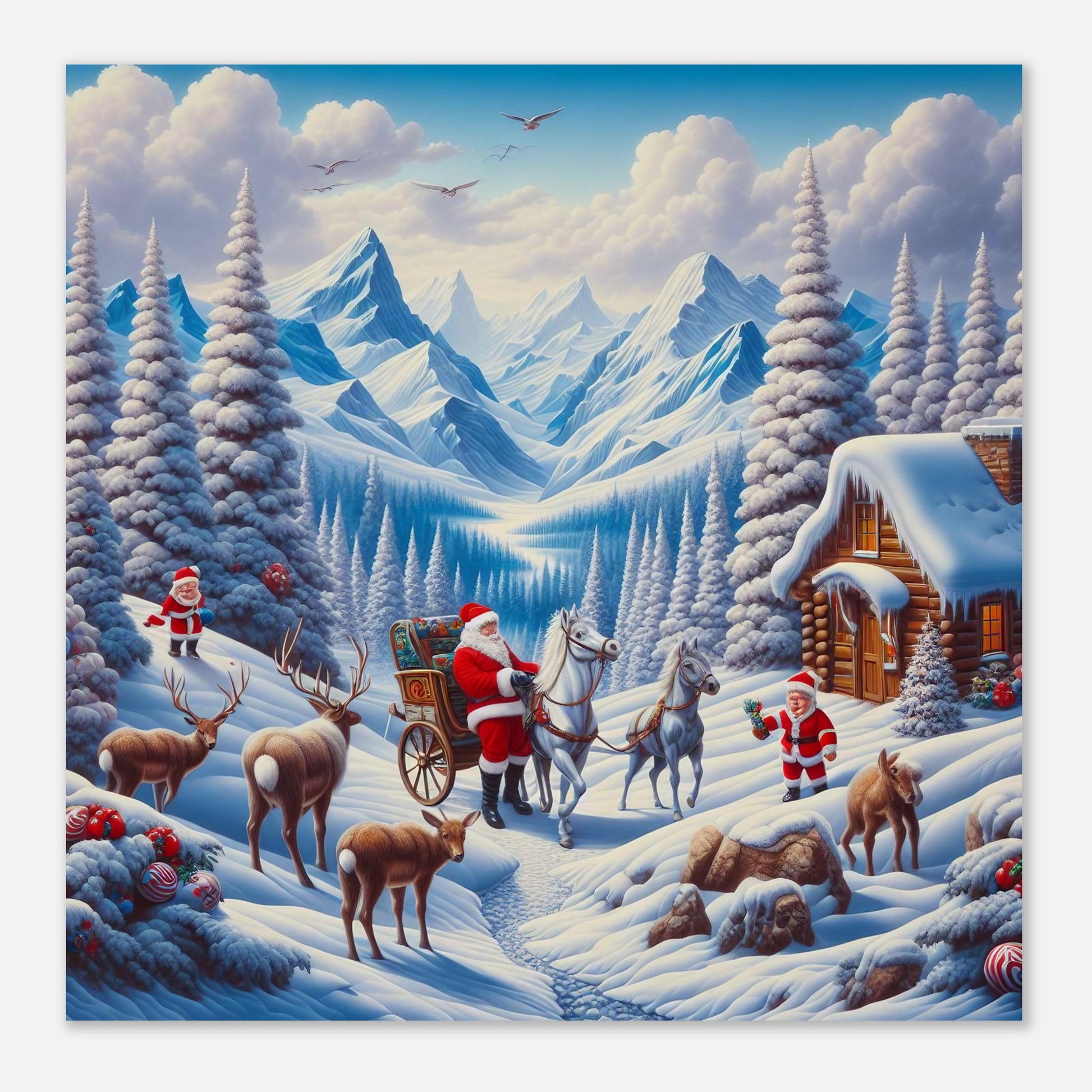 Experience the magic of the holiday season with our Wall Art featuring Santa Claus and horses galloping through a picturesque winter landscape. The stunning scenery of a snow-covered valley, log cabin, and pine trees adds to the charming charm of this piece. Bring the joy and wonder of winter into your home with this beautiful artwork.